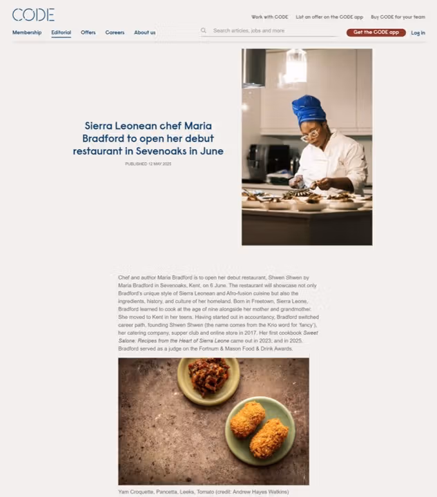 Chef and author Maria Bradford is to open her debut restaurant, Shwen Shwen by Maria Bradford in Sevenoaks, Kent, on 6 June. The restaurant will showcase not only Bradford’s unique style of Sierra Leonean and Afro-fusion cuisine but also the ingredients, history, and culture of her homeland. Born in Freetown, Sierra Leone, Bradford learned to cook at the age of nine alongside her mother and grandmother. She moved to Kent in her teens. Having started out in accountancy, Bradford switched career path, founding Shwen Shwen (the name comes from the Krio word for ‘fancy’), her catering company, supper club and online store in 2017. Her first cookbook Sweet Salone: Recipes from the Heart of Sierra Leone came out in 2023; and in 2025, Bradford served as a judge on the Fortnum & Mason Food & Drink Awards.