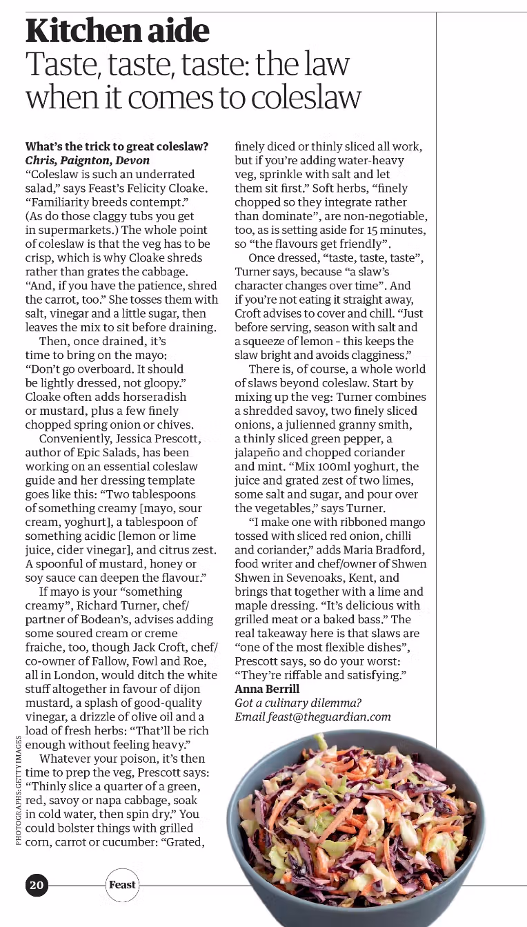 Conveniently, Jessica Prescott, author of Epic Salads, has been working on an essential coleslaw guide and her dressing template goes like this: “Two tablespoons of something creamy [mayo, sour cream, yoghurt], a tablespoon of something acidic [lemon or lime juice, cider vinegar], and citrus zest. A spoonful of mustard, honey or soy sauce can deepen the flavour.”