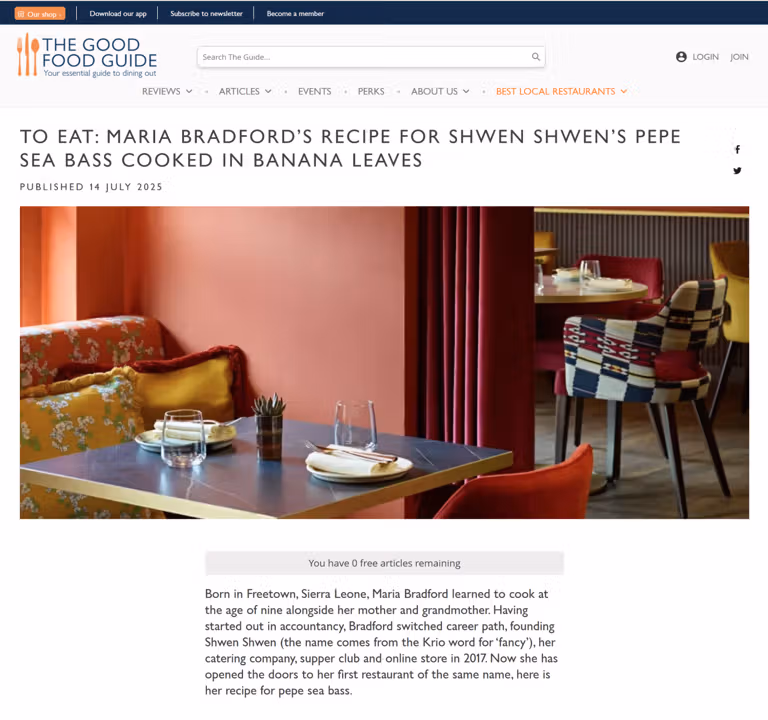Born in Freetown, Sierra Leone, Maria Bradford learned to cook at the age of nine alongside her mother and grandmother. Having started out in accountancy, Bradford switched career path, founding Shwen Shwen (the name comes from the Krio word for ‘fancy’), her catering company, supper club and online store in 2017. Now she has opened the doors to her first restaurant of the same name, here is her recipe for pepe sea bass.